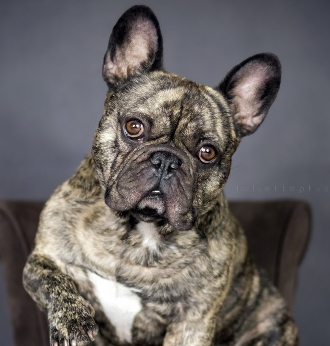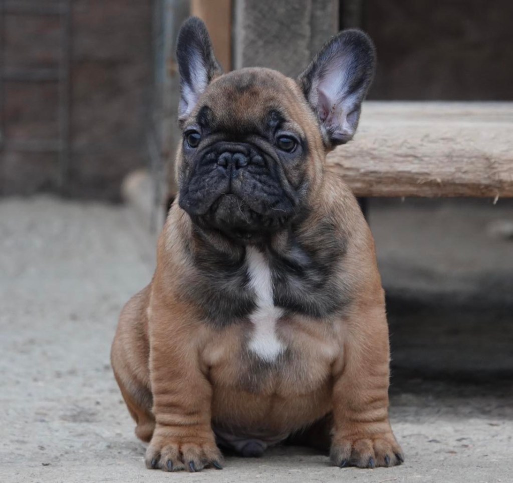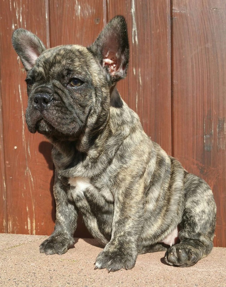 Тигровый окрас собак формируется на фоне соболиного окраса Ay/Ay, при наличии аллеля kbr/-. Он широко варьирует от редких темных полос на рыжем или светлом фоне до так называемого темно-пестрого окраса, т.е. черного с отдельными светлыми пестринами. Столь большая вариабельность тигрового окраса возникает вследствие действия целого ряда генетических факторов, влияющих на интенсивность цвета, форму, ширину и частоту расположения полос. Яркость и тон рыжего фона зависят от характера феомеланина и других аллелей, оказывающих влияние на интенсивность его синтеза. За счет аллелей, оказывающих осветляющее действие на феомеланин, рыже-тигровый окрас французского бульдога может быть видоизменен до серо-тигрового. Таким образом, число возможных фенотипов тигрового окраса оказывается практически безгранично. Этот окрас доминантен по отношению к палевому, поэтому от тигровых производителей возможно рождение рыжих щенков. Собаки тигрового окраса часто имеют темную маску, которая может быть практически незаметной у темно-пестрых бульдогов.