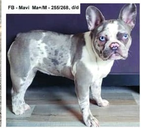 Аллель M в гетерозиготном состоянии (M/m) вызывает развитие мраморного рисунка на фоне, соответствующем основной формуле окраса. Ослабление затрагивает в основном эумеланин, тогда как ослабление феомеланина отсутствует или практически неразличимо. Эффект ослабления пигментации распространяется не только на шерсть, но и на кожу, и на цвет глаз: у мраморных собак нередко встречаются участки с розовой кожей, например, на мочке носа. Также могут быть голубые глаза, либо проявляться гетерохромия – глаза разного цвета, или отдельные сектора радужки с разным цветом. Гомозиготное состояние аллеля М часто связано с проблемами со здоровьем (со слухом и зрением), таких собак называют “двойной мрамор” или “двойной мерль”. Ответственное племенное разведение предполагает вязки мраморных собак M/m только с не-мраморными m/m во избежание рождения щенков c “двойным мерль”. Так как мрамор бывает с минимальным проявлением и может быть замаскирован другими окрасами (например, рецессивно-рыжим), то перед вязкой необходимо тестировать собак при малейшем подозрении, чтобы достоверно знать их статус по мерль. Во французских бульдогах присутствуют практически все аллели мраморного окраса (Mc+; Mc+Ma; Ma; MaM; MaMa; Ma+M; M).