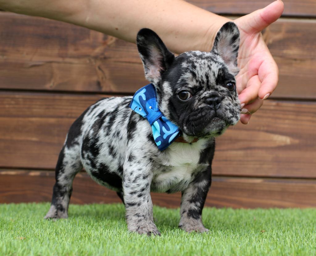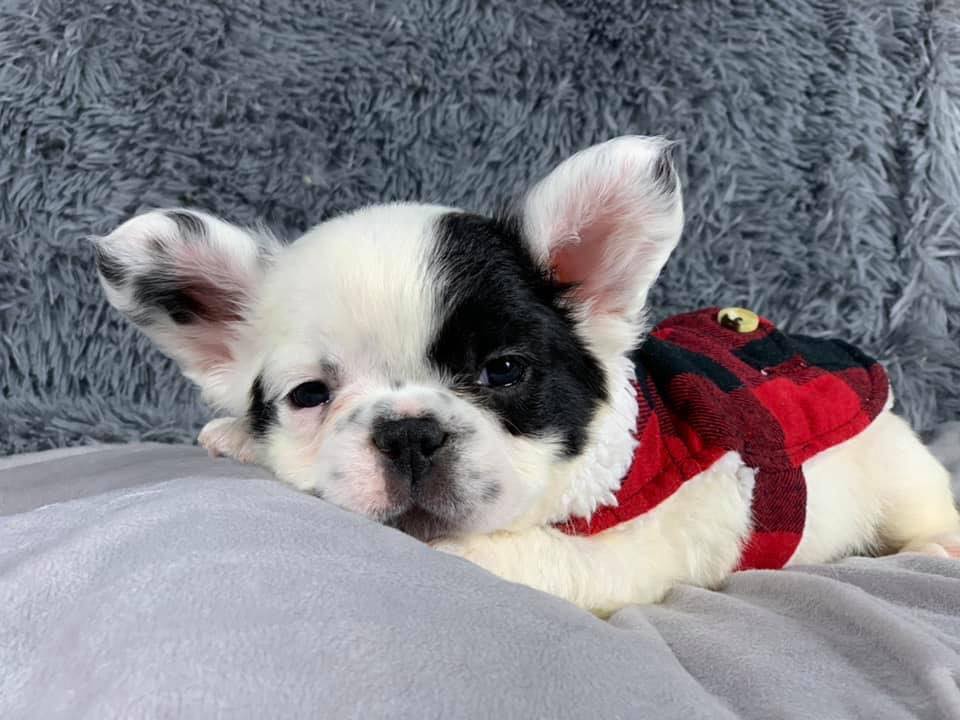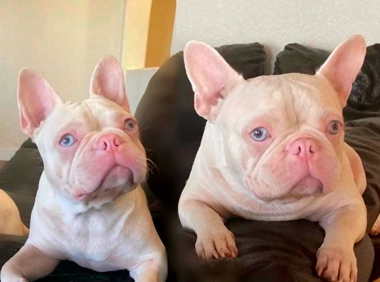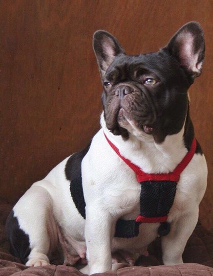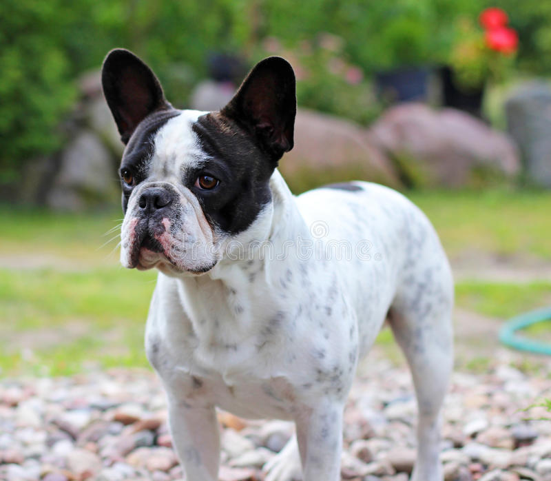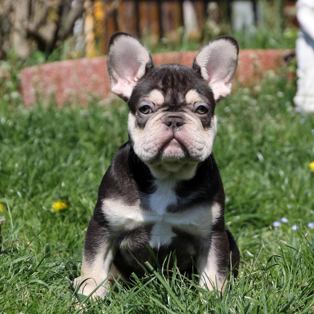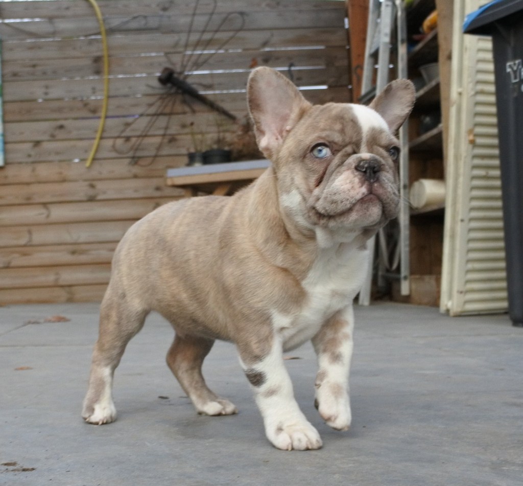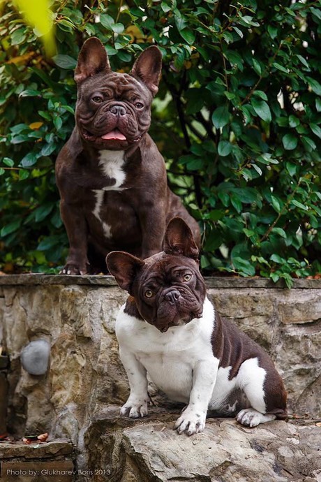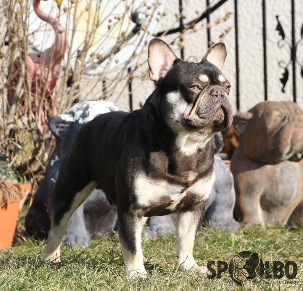 Белая пятнистость, обусловленная аллелями s/s, у французского бульдога предусмотрена стандартом и представлена достаточно широко. Вообще-то в локусе S описаны еще другие аллели (si, sp, sw), определяющие разную степень развития белого пятна. Между этими аллелями наблюдается промежуточный тип наследования, кроме того, существует еще и множество генов модификаторов, также видоизменяющих площадь пятен. Все это делает бессмысленными попытки анализировать каждый конкретный случай пятнистого окраса на предмет наличия особого гена, и на деле вполне достаточно говорить просто о наличии аллелей s/s, не детализируя их глубже. Бульдоги с белыми отметинами, в зависимости от цвета пятен, называются бело-палевыми или бело-тигровыми.