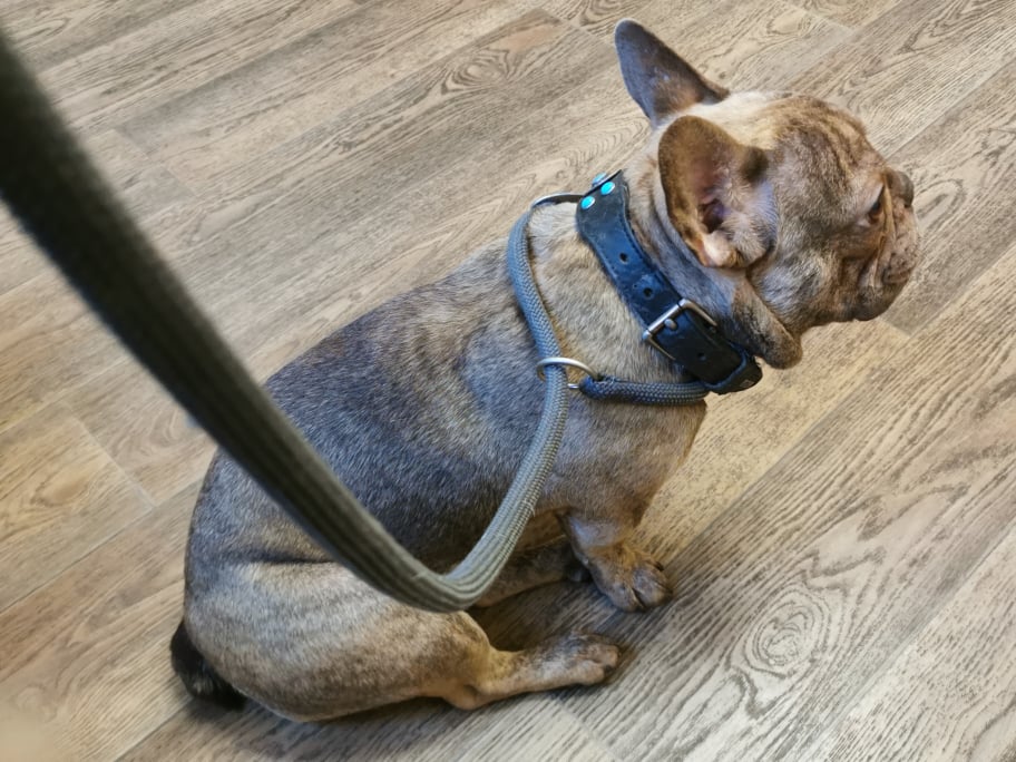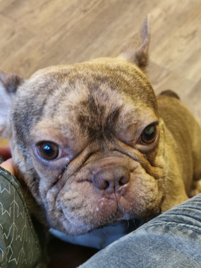 Ниже на фото коричневый тигровый французский бульдог с генотипом Ay/at Co/co Kbr/ky по локусам A, Co и K. ДНК-тест на локус B определил наличие трех мутаций — bc, bd и bs — что означает, что он как раз именно пример такого рекомбинантого аллеля b и, скорее всего, его генотип bs/bc+d или просто b/b. Фенотипически не отличается от обычного b.