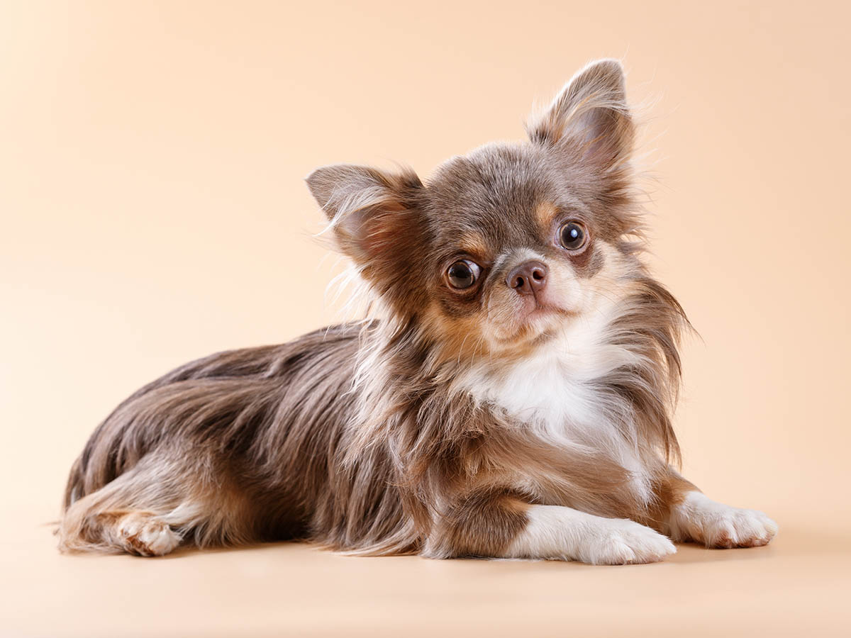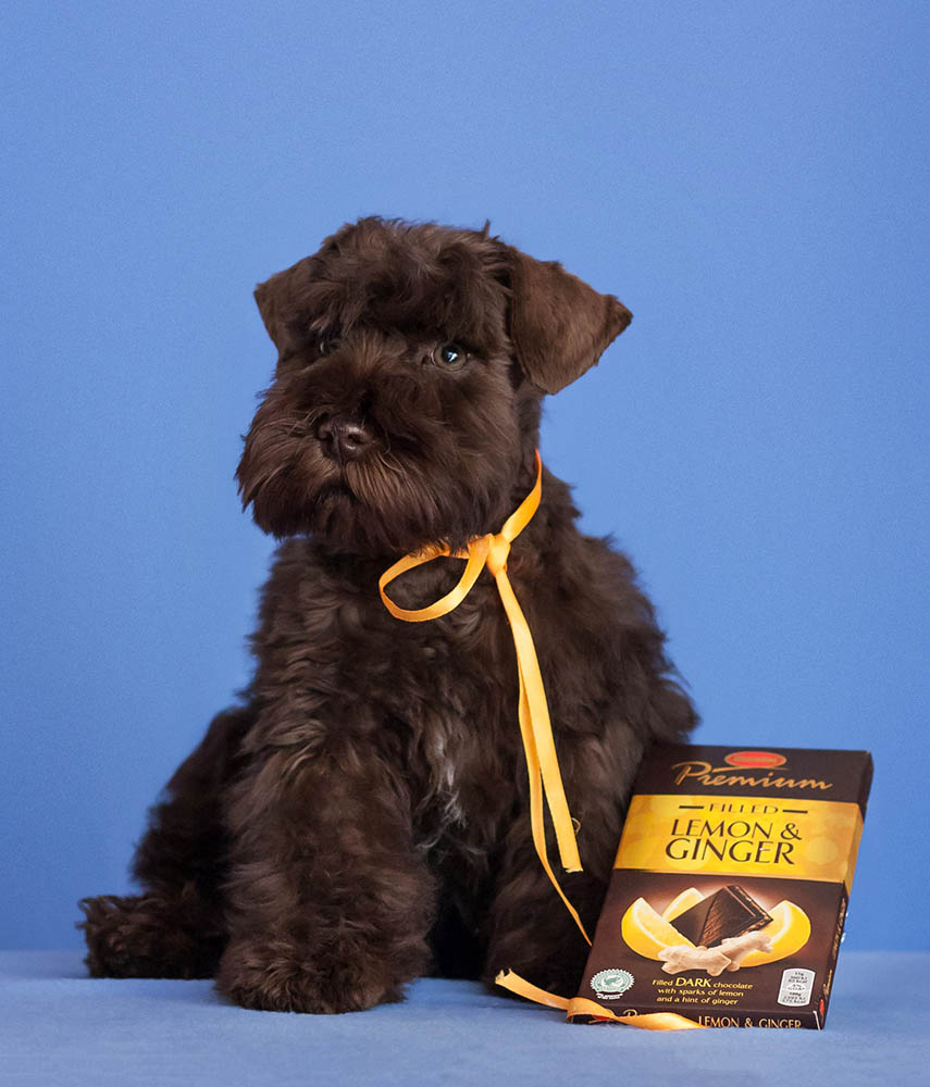 Собака с окрасом какао с подпалом. Генотип со/co B/- at/at ky/ky по локусам CO, B, A и K, соответственно.