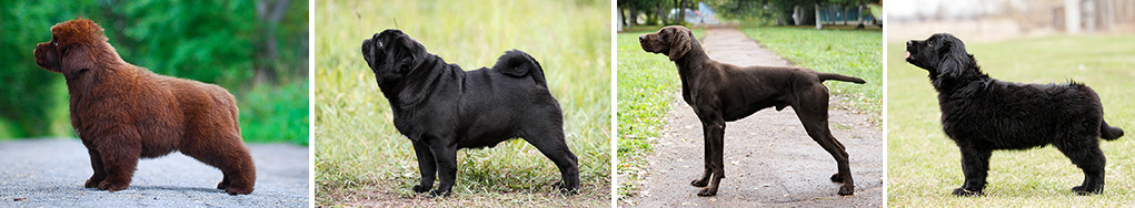На фотографиях ниже показаны типичные примеры проявления аллеля KB в сочетании с разнообразными аллелями других генов окрасов. Практически сплошной черный (с минимальным белым «медальоном» на груди) у щенков на первом фото слева — это классическое представление о доминантном черном окрасе. У бело-черного померанца (второе фото слева) доминантный эумеланиновый (черный) окрас сочетается с пегим (локус S). У американского булли (третий слева направо) доминантный эумеланиновый представлен в сочетании с аллелями ослабленной пигментации, образуя голубой окрас (локус D). И наконец, у курцхаара (крайний справа) доминантный эумеланиновый представлен в комбинации с аллелями коричневого (локус B), а также с белой пятнистостью и крапом (локусы S и T). В каждом из этих примеров присутствие или отсутсвие белой расцветки «идет поверх» равномерного однородного эумеланинового окраса.