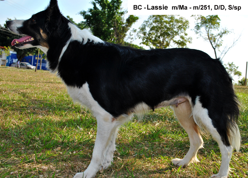 Атипичный мерль Ma (merle atypical) обычно проявляется как более равномерное осветление окраса, относительно равномерное посерение или побурение вместо насыщенной черной пигментации. Бывают случаи с минимальным проявлением этих аллелей у собак с меньшим размером вставки (как выше на фото у бордер колли Ласси).