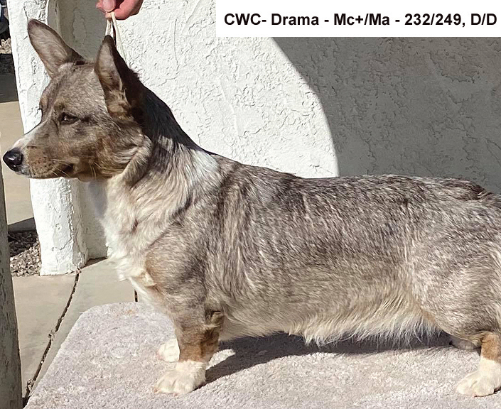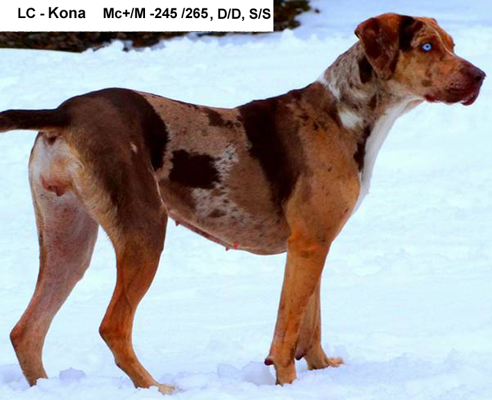 - Mc и Mc+ — криптик мерль, обычно мрамор не проявляется (несмотря на наличие мутации);